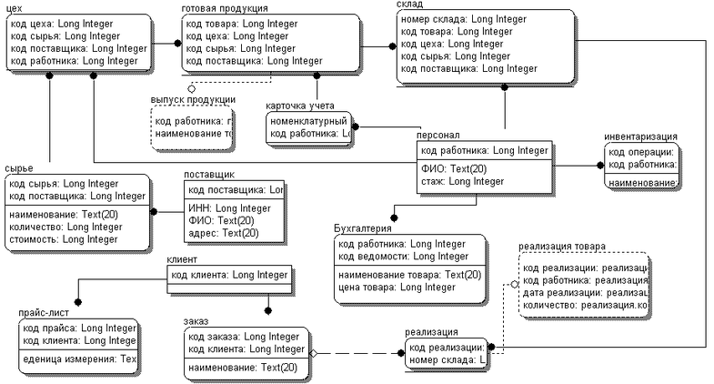 10) Реализация (код реализации, номер склада, код товара, код цеха, код сырья, код поставщика, код работника, номенклатурный номер, дата реализации, наименование, количество, стоимость, код заказа, код клиента)
