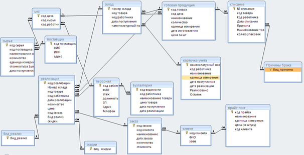 2) Готовая продукция (код товара, код цеха, код поставщика, код работника, наименование товара, количество, единица измерения, дата поступления, дата реализации.)
