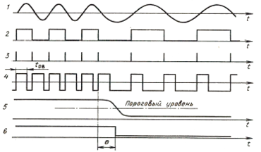 Функциональная схема одного из вариантов ЧМ – демодулятора приведена на рисунке 3.4.2. В её состав входит усилитель-ограничитель (УО) с нулевым порогом ограничения, формирователь коротких импульсов в моменты переходов входного сигнала через нуль (ФКИ), одновибратор (ОВ), фильтр низких частот (ФНЧ) и пороговое устройство (ПУ). Временная диаграмма, иллюстрирующая работу ЧМ- демодулятора, показана на рис. 3.4.3. Импульс фиксированной длительности формируется ОВ в момент пресечения входным сигналом нулевого уровня. Длительность импульса должна быть меньше длительности периода верхней частоты демодулируемого сигнала. Из прямоугольной последовательности импульсов ОВ ФНЧ выделяет постоянную составляющую, которая преобразуется ПУ в посылки постоянного тока.