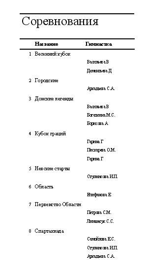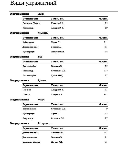 С помощью спроектированной базы данных можно упорядочить учет результатов гимнасток в различных соревнованиях. Удалось собрать и связать данные из различных источников - таблиц и документов, поиск и обработка которых занимали ранее время, усилия и ресурсы. База данных так же предоставляет большие возможности для анализа результатов соревнований и определение направлений развития художественной гимнастики в России.
