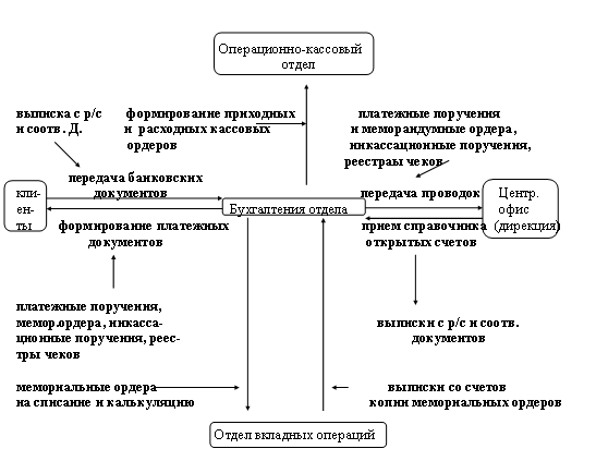 В течение дня в филиале банка собирается и формируется информация, которая затем передается для дальнейшей обработки в центральный офис. Формируются мемориальные ордера по учету прихода и расхода для вкладного отдела физических лиц и для аналогичного отдела юридических лиц, ордера отчетов по валюте и суммы выручки, отчет по кассе. Дааные вводятся в ЭВМ с клавиатуры, а затем через "почтовый ящик" передаются в центральный офис. Если операция с клиентами какого-либо филиала совершалась в центральном офисе, то через "почтовый ящик" необходимо потребовать расписку. В начале каждого дня по телефону сообщается в центральный офис приход и расход по операциям с клиентами. В течение дня необходимая информация, также может быть получена справочная информация. Отчет в бухгалтерии составляется за каждый день, а затем общие итоги в конце каждой недели и месяца. В конце месяца ссотавляется баланс для проверки деятельности каждого филиала. Все эти данные поступают в центр, где подвергаются дальнейшей обработке для полного и достоверного анализа деятельности банка. Центральный офис получает также информацию из Национального банка Украины, а затем оперативная немедленно передается в отделы. Проанализировав информационные потоки, можно сделать вывод: соблюдается логичность маршрута, отсутствуют паралелльные потоки, документы передаются в установленные сроки.