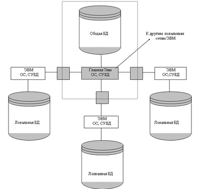 Для организации Ио системы целесообразно использовать БД (базы данных) и БнД (банки данных). БД можно разделить на три группы: децентрализованные, централизованные и распределенные. В данном случае наиболее приемлемой БД является распределенная, то есть БД разделена, распределена по местам сбора и обработки данных, но сохраняется возможность взаимного обмена между локальными БД (см. схему 1). БД в совокупности с СУБД, применяемой для ее создания, ведения, обработки называют БнД. БД и БнД занимают ведущее положение по объему информации, составу решаемых задач, сложности создания и поддержания в достоверном состоянии всей совокупности данных. Однако, это способствует разделению необходимой информации по типам решаемых задач. Данные упорядочиваются, сокращается время на поиск информации, уменьшается вероятность ошибок.