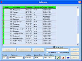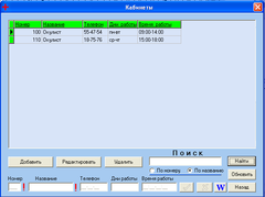 Если Вам нужны данные о кабинетах, то щелкните на «Кабинеты». Откроется новая форма «Кабинеты», с помощью которой можно добавить, редактировать, найти или удалить необходимый кабинет.
