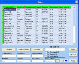 Если Вам нужно узнать о данных врачей, то нажмите на кнопку «Врачи». Появится новая форма «Врачи», с помощью которой можно добавить, редактировать, найти или удалить нужные данные о врачах.