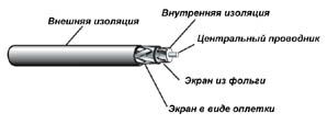 Самый простой коаксиальный кабель состоит из медной жилы, изоляции, ее окружающей, экрана в виде металлической оплетки и внешней оболочки.