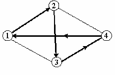 Посмотрим, как поведет себя при решении ЗК жадный алгоритм. Здесь он превратится в стратегию “иди в ближайший (в который еще не входил) город”. Жадный алгоритм, очевидно, бессилен в этой задаче. Рассмотрим для примера сеть на рисунке 3, представляющую узкий ромб. Пусть коммивояжер стартует из города 1. Алгоритм “иди вы ближайший город” выведет его в город 2, затем 3, затем 4; на последнем шаге придется платить за жадность, возвращаясь по длинной диагонали ромба. В результате получится не кратчайший, а длиннейший тур.