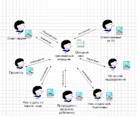 Мнемосхема наглядно отображает происходящие процессы, заполнения, инструктаж, подписания, согласования и утверждения обходного листа с задействованными в этом процессе лицами. Стрелками показано взаимодействие между элементами.