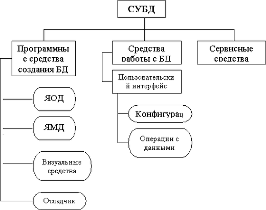Современная СУБД содержит в своем составе программные средства создания баз данных, средства работы с данными и сервисные средства. С помощью средств создания БД проектировщик, используя язык описания данных (ЯОД), переводит логическую модель БД в физическую структуру, а на языке манипуляции данными (ЯМД) разрабатывает программы, реализующие основные операции с данными (в реляционных БД – это реляционные операции) (см. рис. 2.1). При проектировании привлекаются визуальные средства, т.е. объекты, и программа-отладчик, с помощью которой соединяются и тестируются отдельные блоки разработанной программы управления конкретной БД.