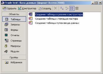 Основные разделы главного окна соответствуют типам объектов, которые может содержать база данных Access. Это Таблицы, Запросы, Отчеты, Макросы и Модули. Заголовок окна содержит имя файла базы данных. В данном случае он называется TradeTest.