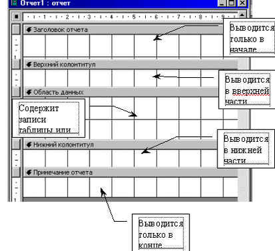 В режиме конструктора разделы представлены в виде полос, и каждый содержащийся в отчете раздел представлен один раз. В напечатанном отчете разделы могут повторяться неоднократно. Способ отображения сведений в каждом разделе определяется расположением элементов управления, таких как надписи и поля.