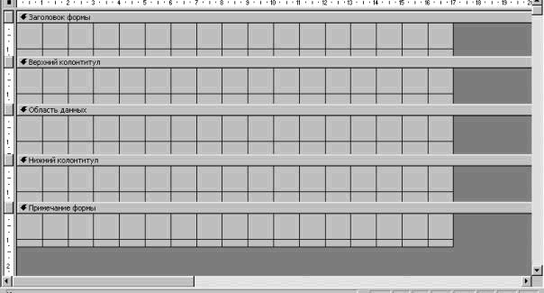 По умолчанию в окне Конструктора формы выводится раздел проекта Область данных, в котором размещают поля БД из таблицы или запроса, а также вычисляемые поля. Кроме данного раздела при конструировании могут быть востребованы и другие разделы: