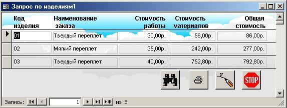 Запрос формирует таблицу, имеющую следующие поля: Код изделия, Наименование изделия, Код клея, Расход клея, код картона, Расход картона, Код пружины, Расход пружины, Стоимость материалов, Стоимость работы, Общая стоимость.