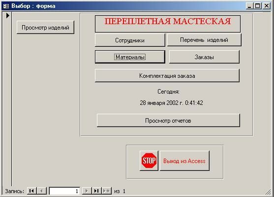 Для удобства была создана управляющая форма, которая запускается автоматически в момент открытия базы данных “Переплетная мастерская”. Она позволяет быстро выбрать нужную форму для ввода данных, просмотреть отчеты, сделать запросы, а также отображает текущую дату и управляющие кнопки “STOP” – закрыть форму и “Выход из Ассess”. Данная форма