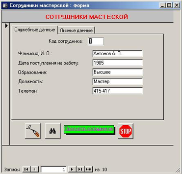 Форма для ввода сотрудников и комплектации заказов кроме полей ввода имеют дополнительные управляющие кнопки. Например, кнопка “Поиск” позволяет осуществить выбор нужной записи, кнопка “Стоп” закрывает текущую форму, кнопка “Просмотреть сотрудников” позволяет просмотреть список сотрудников в режиме отчета, кнопка с карандашом позволяет добавить новую запись.