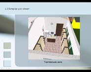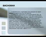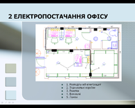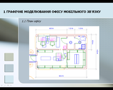 У графічному моделюванні був змодельований офіс, що працює у сфері мобільного зв’язку. План офісу розроблявся, виходячи з кількості співробітників і заданого устаткування (2 комп'ютери, 2 принтери, сканер, 2 блоки безперебійного живлення, музичний центр, осцилограф). На плані показані меблі, комп’ютери, електротехнічні арматури (світильники, вимикачі, розетки), вікна й двері. Розроблений дизайн офісу (килимове покриття, кольори стін, форми вікон і т.д.). На території крім офісу, розміщені газони, доріжки, під’їзд для автомобіля. Був зроблений альтернативний вибір комп'ютерного забезпечення. План офісу займає 27,5 м².