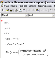 Систему нелінійних рівнянь можна вирішити за допомогою блоку Given...Find. Функція Find шукає точне рішення системи рівнянь, записаної після слова Given [9].