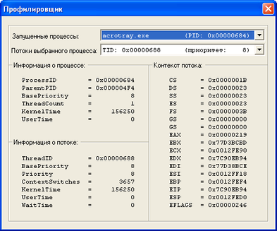 В верхней части диалога находятся два ниспадающих списка, верхний из которых отображает список запущенных процессов в системе, а нижний – список потоков этого процесса. С помощью этих элементов управления можно указать приложению, за каким процессом и каким потоком этого процесса вести наблюдение.