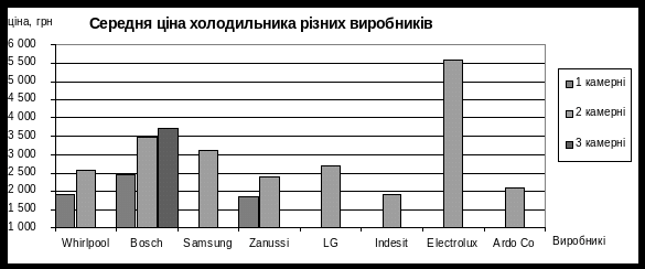 середня ціна холодильнику за кількістю камер для різних виробників,