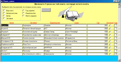 И последняя вкладка, Найти и взять книгу, содержит данные о тех книгах, которые читатель брал. При нажатии на кнопку Поиск книги откроется форма Поиск_книги, на которой читатель может найти книгу по заданным параметрам и взять ее.
