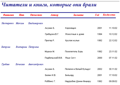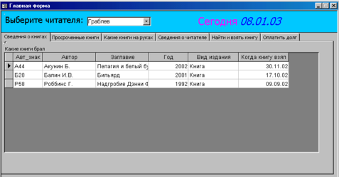 На данной вкладке представлена информация обо всех тех книгах, которые брал тот читатель, чья фамилия выбрана в заголовке формы.
