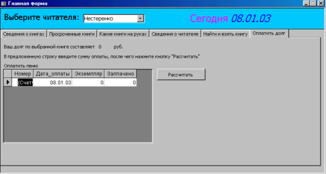 Вкладка Просроченные книги содержит информацию о просроченных книгах и о той сумме, которую следует заплатить (поле Пеня). При двойном нажатии на данное поле происходит переход на вкладку Оплатить долг.
