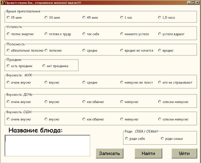 Вся работа с программой на момент обучения будет сводиться к простому выбору «параметров» приготовления блюда, записи его названия и нажатия кнопки «ЗАПИСАТЬ». После этого новая запись будет сохранена в файле «до лучших времен».