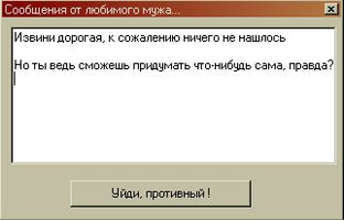 Весь интерфейс программы я старался сделать наиболее «доброжелательным» к женщинам, снабдил некоторыми шутками и подсказками. Например если после того как женщина ничего не найдет в базе на свой запрос появиться сообщение (рис 2), которое быстро должно не дать ей огорчиться и заставит ее улыбнуться!