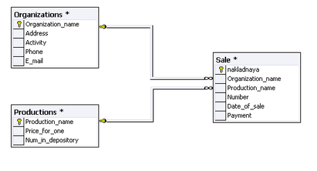Вся информация, которая должна храниться в создаваемой БД, можно разбить на три таблицы. Первая таблица "Organizations" будет хранить информацию об организациях, приобретающих продукцию завода, вторая "Productions" - информацию о продукции и третья "Sale" - информацию о продажах.