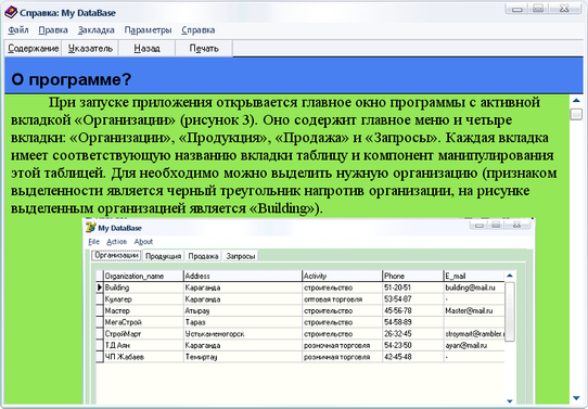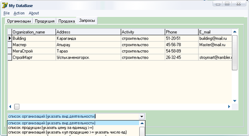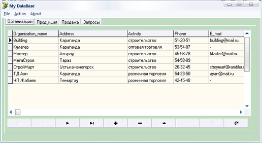 При запуске приложения открывается главное окно программы с активной вкладкой "Организации" (рисунок 3). Оно содержит главное меню и четыре вкладки: "Организации", "Продукция", "Продажа" и "Запросы". Каждая вкладка имеет соответствующую названию вкладки таблицу и компонент манипулирования этой таблицей. Для необходимо можно выделить нужную организацию (признаком выделенности является черный треугольник напротив организации, на рисунке выделенным организацией является "Building").
