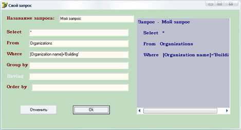 Четвертая вкладка содержит список запросов (Рисунок 4). Здесь пользователь может выбрать из списка один из предложенных запросов, либо в списке запросов выбрать "создать запрос…", либо в меню Action выбрать Make query. В результате появится диалоговое окно (Рисунок 5), где можно ввести нужные критерии запроса и нажать "ОК". Результат запросов отображается в таблице на вкладке "Запросы".