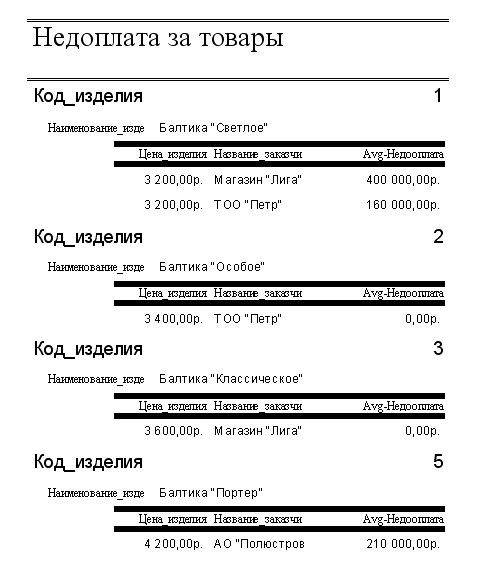 Информацию по недоплаченным изделиям можно получить в отчете «Недоплата за товары». Содержание соответствующего отчета представлено на рис.4.
