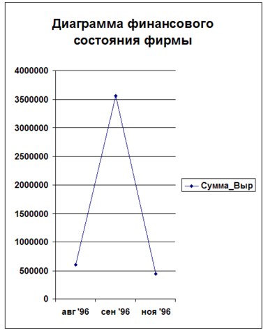 На графике отображающем состояние финансового положения фирмы по месяцам видно что с августа по сентябрь фирма заработала (3500000 – 600000=2900000) р . Значит в этом месяце были заказы с полной оплатой отгруженой продукции или заказы с небольшим кредитом. В следующем месяце заметно снижение следовательно были заказы с большим кредитом. Точка на графике в сентябре остановилась на отметке 400000 значит необходимо отменять сделки при которых существует кредит до периода возврата предыдущих долгов или до сделок с полной оплатой либо оплатой больше 50% продукции, иначе граафик пойдет ниже, и пересечет прямую 300000. Это говорит о том, что в следующем месяце у фирмы не будет средств на производство продукции, зарплату, произойдет банкротство.