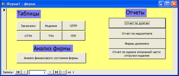Таким образом, поставленная задача решена. Разработанная база данных позволяет на основе хранимых данных (об отгрузках и оплатах за отгруженную продукцию) по запросу пользователя производить автоматизированный анализ оплаты для заданного изделия и выдавать соответствующий отчет. Отчет содержит сведения об оплаченной части отгруженных изделий и недооплате. Кроме того, выдается список изделий по всей номенклатуре, по которым имеется недооплата. Также для удобства пользователя программа формирует отчет, содержащий информацию о заказчиках-должниках и общей сумме недоплаты. В итоге проведенной работы был дан анализ состояния фирмы по месяцам.