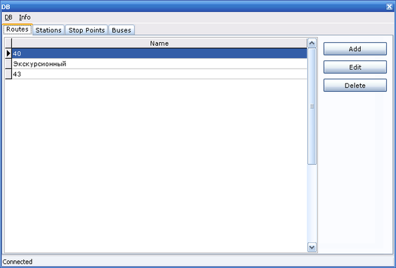 По умолчанию активна первая вкладка «Routes», на которой отображаются маршруты. Перемещаясь по вкладкам можно просмотреть сведения об остановках, остановочных пунктах и автобусах парка. Добавление, редактирование и удаление данных во всех таблицах осуществляется аналогичным образом. поэтому будет рассмотрено на примере таблицы остановочных пунктов.