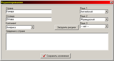 С помощью этой формы пользователь может редактировать существующую страну. При нажатии кнопки «Загрузить рисунок» появится диалоговое меню выбора файла формата «BMP» в котором содержится изображение флага. Имеется контроль за правильностью выбора языков (т.е языки не могут повторятся, не может существовать второго государственного языка если не существует первого и т.п.). После заполнения формы пользователь должен нажать кнопку «Сохранить изменения» и если форма заполнена корректно – изменения в БД сохранятся, а если нет, то выскочит предупреждение об ошибке.