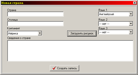 С помощью этой формы пользователь может создать новую страну. При нажатии кнопки «Загрузить рисунок» появится диалоговое меню выбора файла формата «BMP» в котором содержится изображение флага. Имеется контроль за правильностью выбора языков (т.е языки не могут повторяться, не может существовать второго государственного языка если не существует первого и т.п.). После заполнения формы пользователь должен нажать кнопку «Создать запись» и если форма заполнена корректно – запись создастся, а если нет, то выскочит предупреждение об ошибке.