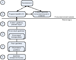 Над стеком находятся приложения. Они обрабатывают запросы пользователя или других приложений и вызывают или подсистему Win 32 или клиент драйвер пользовательского режима.