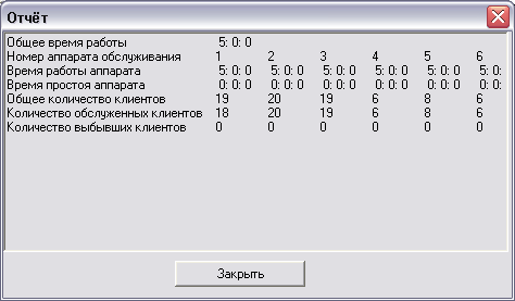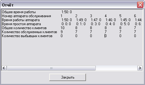 | Общее время работы | Номер аппарата обслуживания | Время работы аппарата | Время простоя аппарата | Общее количество клиентов | Количество обслуженных клиентов | Количество выбывших клиентов |