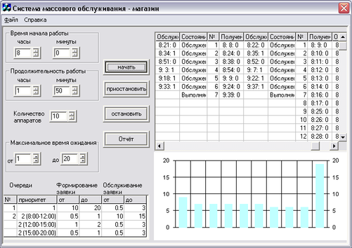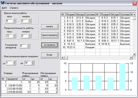 В программе также есть возможность изменения промежутков формирования заявок на обслуживание и времени самого обслуживания для разных приоритетов и в зависимости от текущего времени обслуживания, что является очень важным моментом в работе данного СМО (рис.1 - 5). Существует два типа приоритетов: первый - это клиенты, обслуживаемые вне очереди и второй - клиенты, обслуживаемые всегда в порядке очереди. Для обслуживания так же есть параметр время ожидания (рис.1 - 4). Этот параметр показывает промежуток времени, в течение которого клиент может не дождаться начала обслуживания и покинуть очередь. Для того чтобы начать процесс моделирования необходимо нажать на кнопку “начать" (рис.1 - 6). Процесс моделирования можно остановить совсем, нажав кнопку “остановить" (рис.1 - 8) или приостановить временно с помощью кнопки “приостановить” (рис.1 - 7), его можно начать, заново нажав кнопку “Начать". Во время работы программы текущие результаты отображаются в таблице (рис.1 - 10). По окончанию работы программы выводится текстовый файл с основными результатами. Результаты работы программы можно также просмотреть, нажав кнопку “Отчёт” (рис.1 - 9).