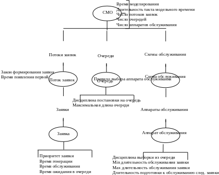 Декомпозиция СМО как сложной системы и представление ее в виде иерархии подсистем с позиции концепции имитационного моделирования показана на рисунке 2.2 на схеме показаны основные параметры каждого элемента, которые были учтены при выполнении данного проекта.