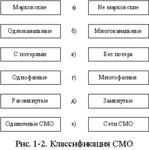 Прежде всего они разделяются на марковские и немарковские (рисунок 2.1, а), что связано с определенными классами марковских процессов, с помощью которых описывается их динамика. Эти два класса систем массового обслуживания аналогичны соответственно линейным и нелинейным системам автоматического регулирования, динамика которых описывается линейными и нелинейными дифференциальными уравнениями. Так же как и в теории автоматического регулирования, не существует общих методов расчета нелинейных СМО.