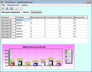 Моделируя реальные процессы, пользователь может проследить, как изменяется эффективность работы системы. А затем, может сделать выводы о том, при каких установках система будет работать максимально производительно, сколько следует установить аппаратов, чтобы время простоя аппарата было минимально, а время занятости максимальным.