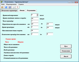 В начале работы активизируется вкладка "Начальные параметры". Здесь пользователь может задать свои параметры системы, такие как время моделирования, время ожидания в очереди, количество процедур, периодичность прихода клиентов, время процедуры, максимальная длина очереди, количество процедур для клиента (Рисунок 3.2). На вкладке также имеются кнопки "Пуск", "Остановить", "Выход", которые соответственно позволяют начать процесс моделирования, остановить его и завершить работу.