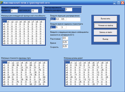 Таким образом, по завершении работы программы, также должны быть получены следующие значения: матрица, характеризующая узкие места в сети, и рекомендуемая матрица пропускной способности для данной сети дорог.