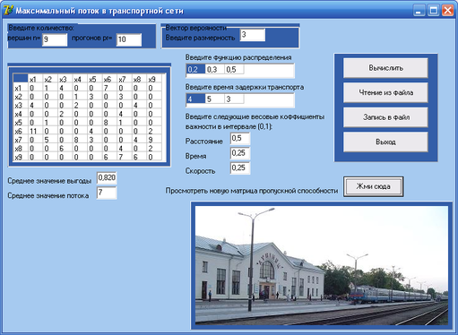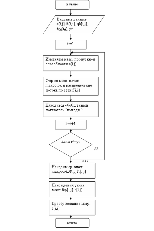 Если i<=pr, то программа продолжает первоначальные вычисления. В противном случае (если i>pr) вычисляется следующие средние значения: максимальный поток maxpotok, распределение потоков f [i,j] и обобщённый показатель “выгоды" Фzy на каждом прогоне. Далее определяются узкие места в сети. Для этого вычисляются значения: fср [i,j] -c [i,j] и в тех местах, где матрица принимает отрицательные значения на величину этой разницы увеличиваются пропускные способности матрицы c [i,j] для обеспечения рациональной организации потоков железнодорожной сети.