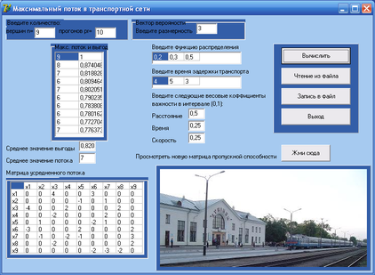 Таким образом, на форме представлены следующие результаты работы программы: матрица размером 2х10, в первом столбце которой представлены значения максимальных потоков на каждом прогоне, во втором - значения обобщенных показателей “выгоды"; среднее значение показателей выгоды и максимальных потоков, полученных на каждом прогоне; матрица усредненного потока.