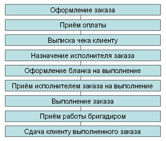 Клиент приходит на станцию технического обслуживания и обращается к секретарю. Секретарь на специальном бланке оформляет заказ, проставляет в нём стоимости всех услуг согласно ценам, поставленным данной организацией, которые прописаны в постановлении о стоимости услуг. Далее секретарь подсчитывает стоимость всего заказа, принимает оплату от клиента и выписывает чек. В чеке прописываются данные заказчика, данные его автомобиля, номер заказа, стоимость. В конце дня секретарь сдаёт все эти бланки менеджеру. На следующий день менеджер ознакамливается с оформленными заказами и распределяет их по мастерам, учитывая загруженность того или иного мастера, прописывая его данные на бланке заказа. Далее менеджер оформляет бланк на выполнение, в котором прописывает номер заказа, данные мастера, услуги, требования и сроки выполнения. Бланки на выполнение сдаются бригадиру, который доставляет их мастерам. Мастер принимает заказ на выполнение, ознакамливается с требованиями и подписывает бланк на выполнение. После выполнения заказа мастер оповещает об этом бригадира. Бригадир принимает работу и, если нет замечаний, отмечает на бланке на выполнение завершение заказа, информирует менеджера о выполнении заказа и сдаёт бланк. Менеджер отмечает в бланке заказа выполнение, в книге "Отчёты заработной платы" прописывает сумму от выполненного заказа мастеру, отдаёт бланк выполненного заказа секретарю. Когда клиент приходит за своим заказом, секретарь по чеку заказчика ищет бланк выполненного заказа. Если такой имеется, то клиента направляют к бригадиру с бланком заказа. Бригадир сдаёт работу клиенту. Если клиент не имеет претензий, он забирает свой автомобиль и ставит на бланке заказа в графе замечания "нет замечаний". После этого бригадир возвращает бланк секретарю, секретарь закрепляет степлером бланк заказа, чек заказчика и бланк на выполнение и складывает в архив. Если же клиент не удовлетворён работой, то заказ ставится на учёт "Доработка" и возвращается мастеру. После выполнения доработки заказ проходит тот же путь, что и после первого выполнения.