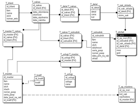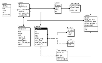 Таким образом выделены следующие объекты: заказ, клиент, сотрудник, принимающий участие в организации заказа (секретарь, менеджер, бригадир), мастер, услуга, квалификация, заработная плата мастера, деталь, заказ деталей, отчёт по распределению финансов.