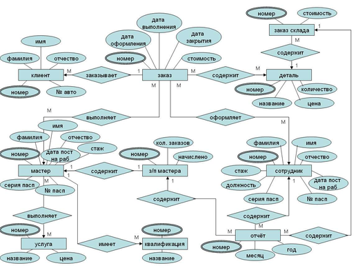 Секретарь оформляет заказ. Менеджер принимает заказ на выполнение, формирует задание для мастеров и передаёт бригадиру. Бригадир принимает на выполнение, принимает выполненный заказ и снимает его с выполнения. Таким образом заказ содержит информацию о клиенте, обо всех сотрудниках, принимавших участие в организации заказа, о всех мастерах, выполнявших заказ, и об услугах, которые они выполняют о деталях, использовавших в заказе. Связь между клиентом и заказом будет один-ко-многим, так как в заказе может быть только один клиент, а у одного клиента может быть несколько заказав, причём даже сделанных в разное время. Связь между сотрудниками и заказом - многие-ко-многим, так как в организации заказов принимают участие несколько сотрудников, но также каждый из сотрудников организовывает много заказов. Аналогично, определяются связь между заказом и мастером. Связь между заказом и деталью тоже будет многие-ко-многим, так как в одном заказе могут быть несколько деталей, также детали, имеющие одни и те же параметры могут быть использованы, в разных заказах.