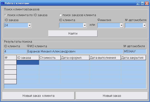 В зависимости от выбранной категории поиска результаты будут различны. Если осуществляется поиск по категории "поиск клиента по ID заказа", то выведется только информация о клиенте в поля Edit1 (ID клиента), Edit2 (ФИО клиента), Edit3 (№ автомобиля). Если же поиск осуществляется по категории "поиск заказов клиента", то кроме информации о клиенте выведется также информация о всех его заказах в виде таблицы StringGrid1.